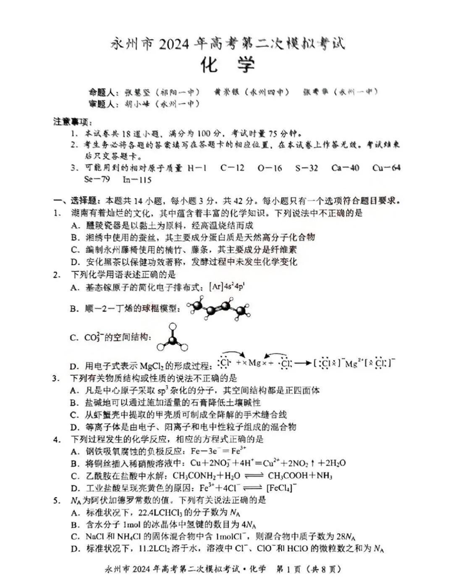 2024届湖南省永州市高三上学期第二次模拟考试 化学