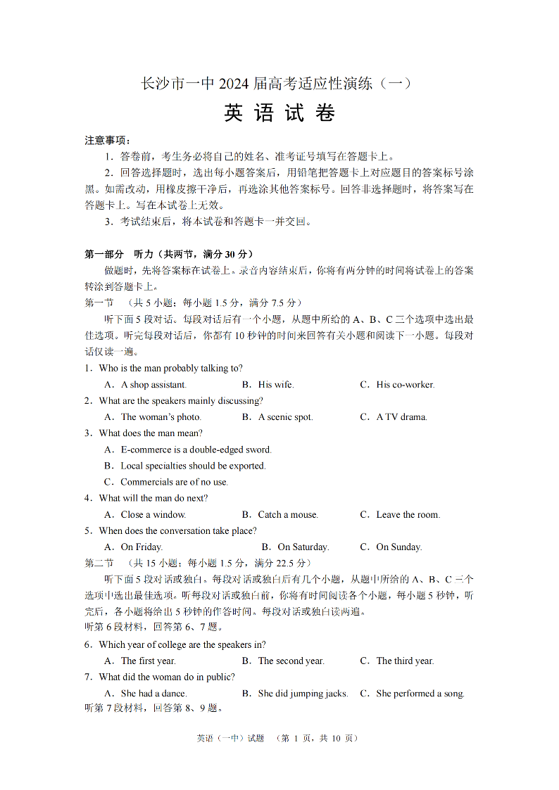 2024届湖南省长沙市第一中高三下学期高考适应性演练(一)英语