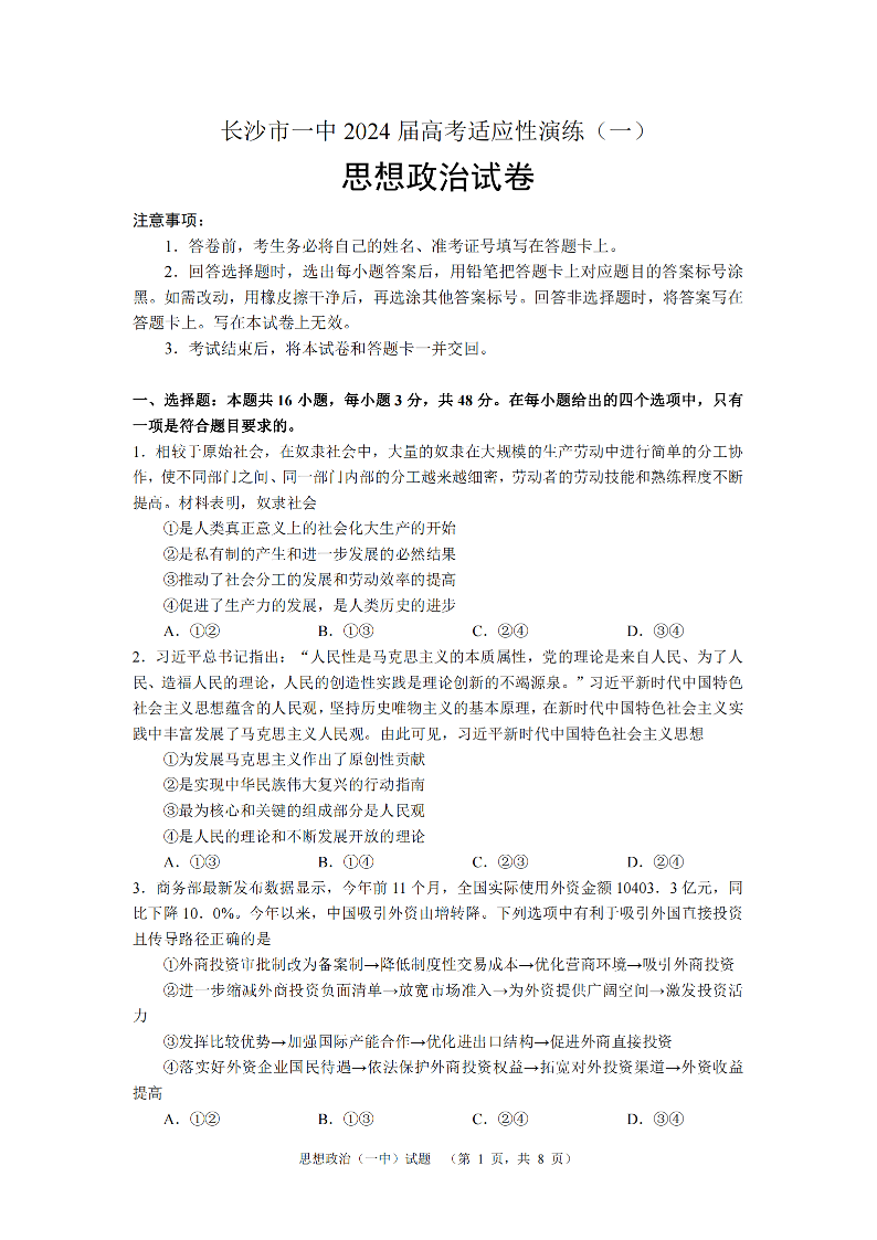 2024届湖南省长沙市第一中高三下学期高考适应性演练(一)政治