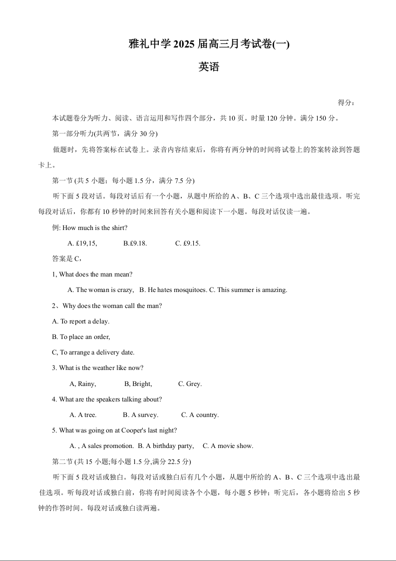 湖南省雅礼中学2025届高三月考试卷(一)英语