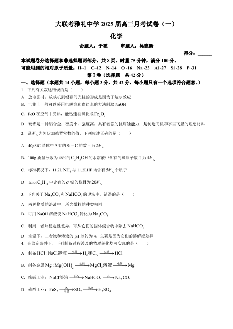 湖南省雅礼中学2025届高三月考试卷(一)化学