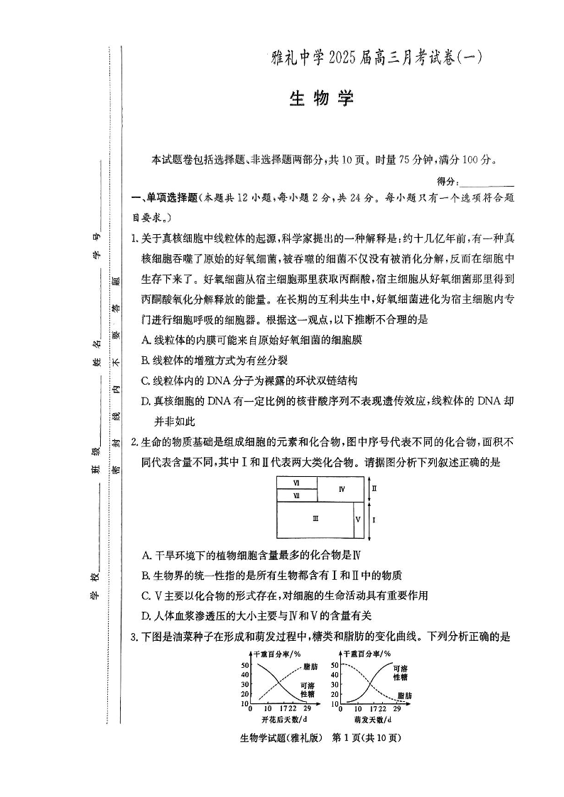 湖南省雅礼中学2025届高三月考试卷(一)生物