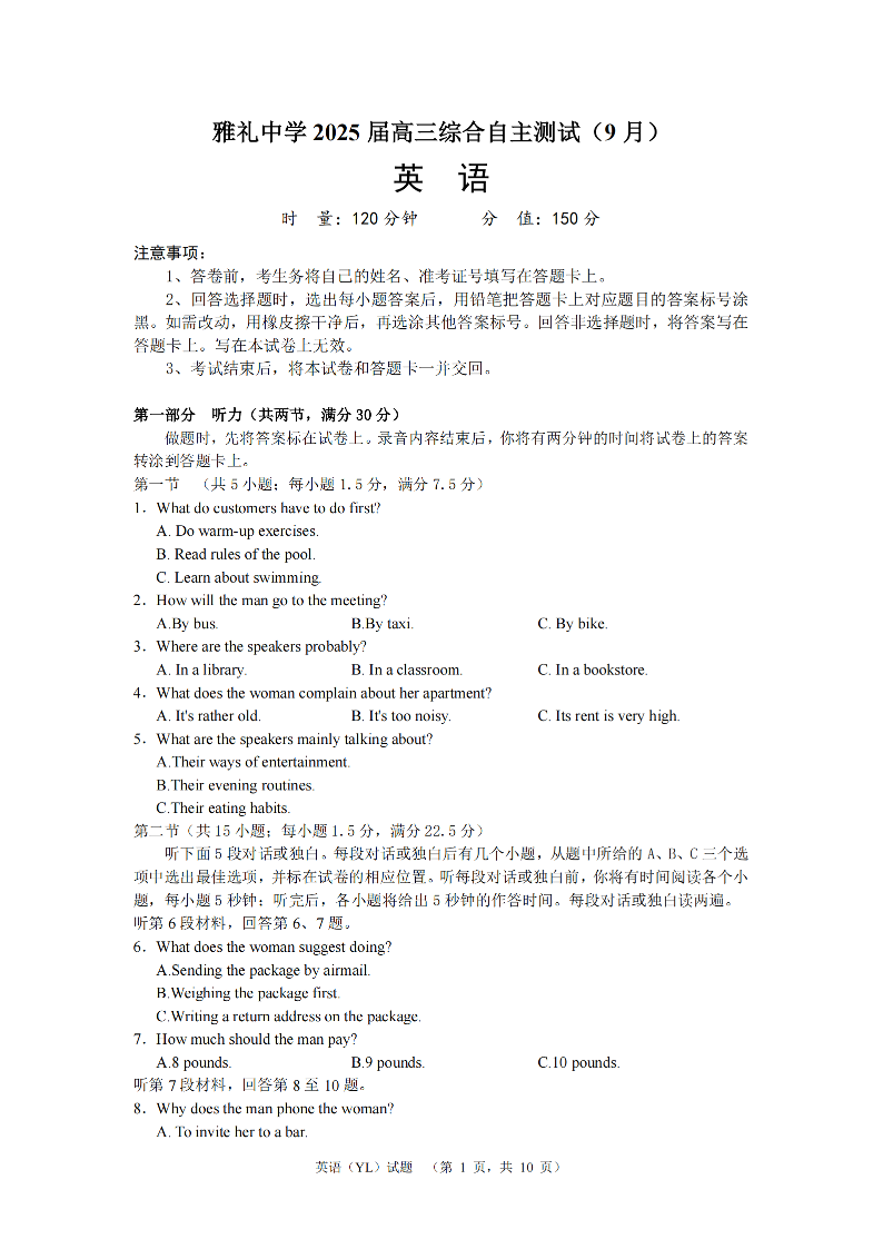 湖南省雅礼中学2025届高三综合自主测试(9月)+英语
