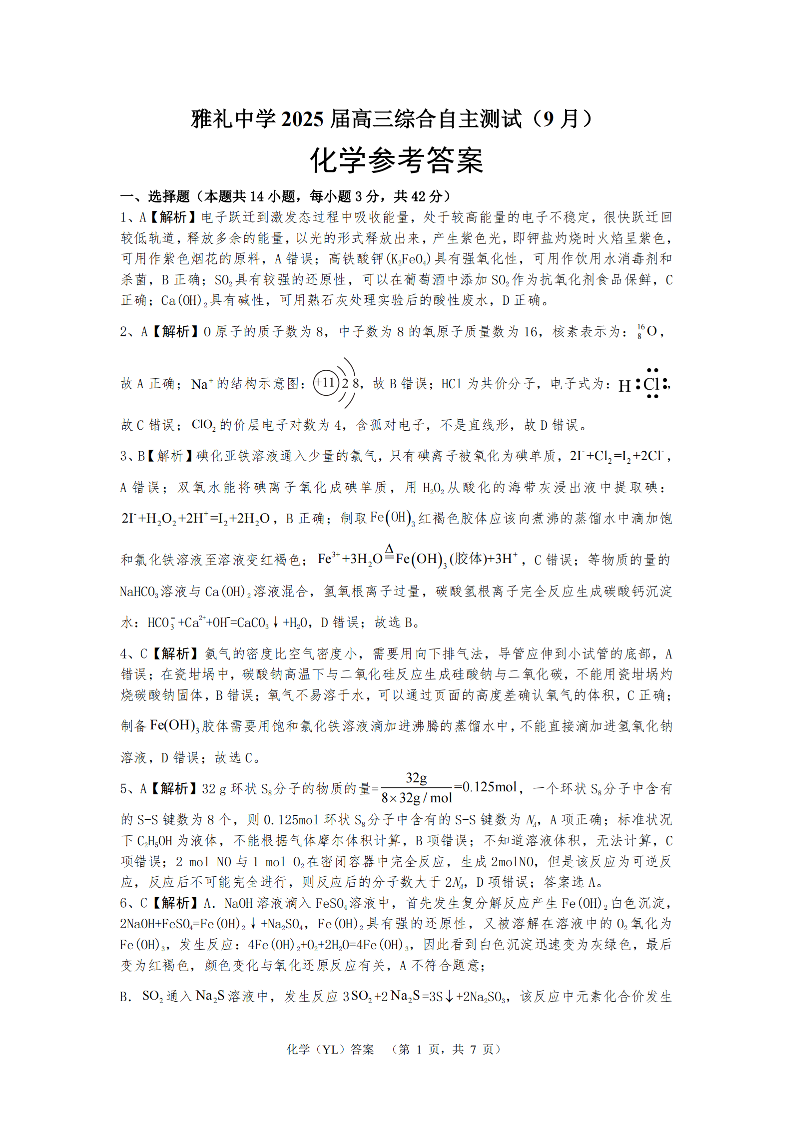 湖南省雅礼中学2025届高三综合自主测试(9月)+化学答案