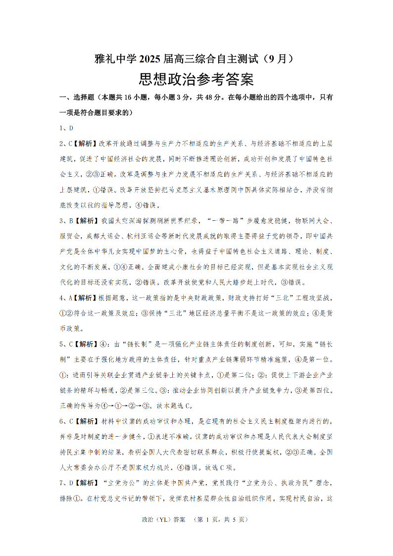 湖南省雅礼中学2025届高三综合自主测试(9月)+政治答案