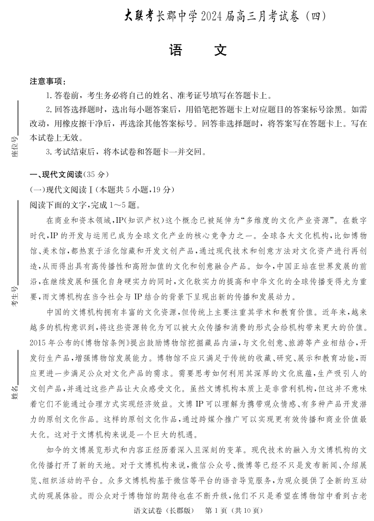 湖南省长沙市长郡中学2023-2024学年高三上学期月考(四)语文