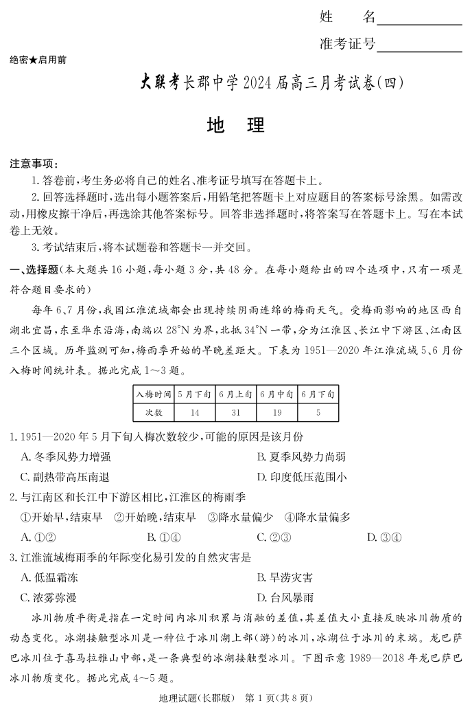 湖南省长沙市长郡中学2023-2024学年高三上学期月考(四)地理