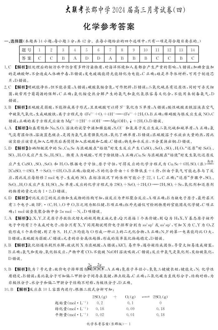 湖南省长沙市长郡中学2023-2024学年高三上学期月考(四)化学答案