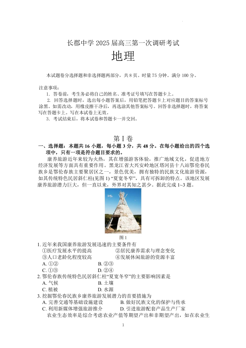 湖南省长郡中学2025届高三第一次调研考试+地理