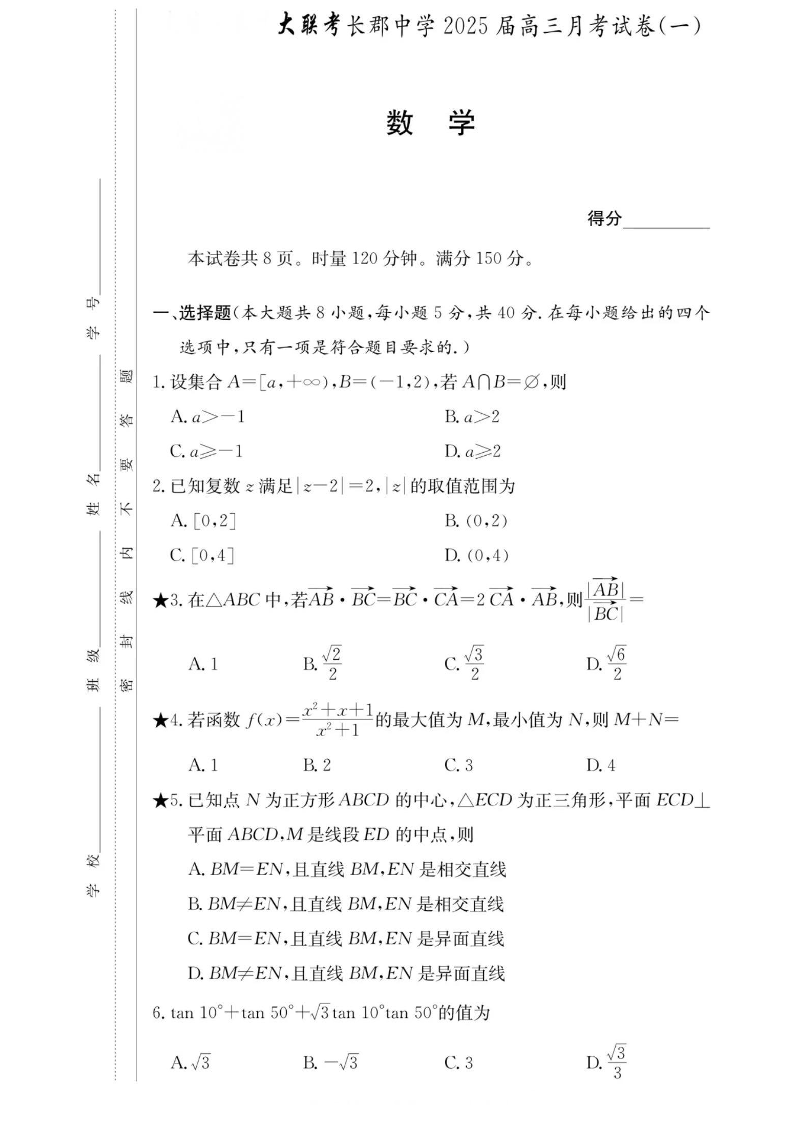 湖南省长郡中学2025届高三年级月考试卷(一)数学