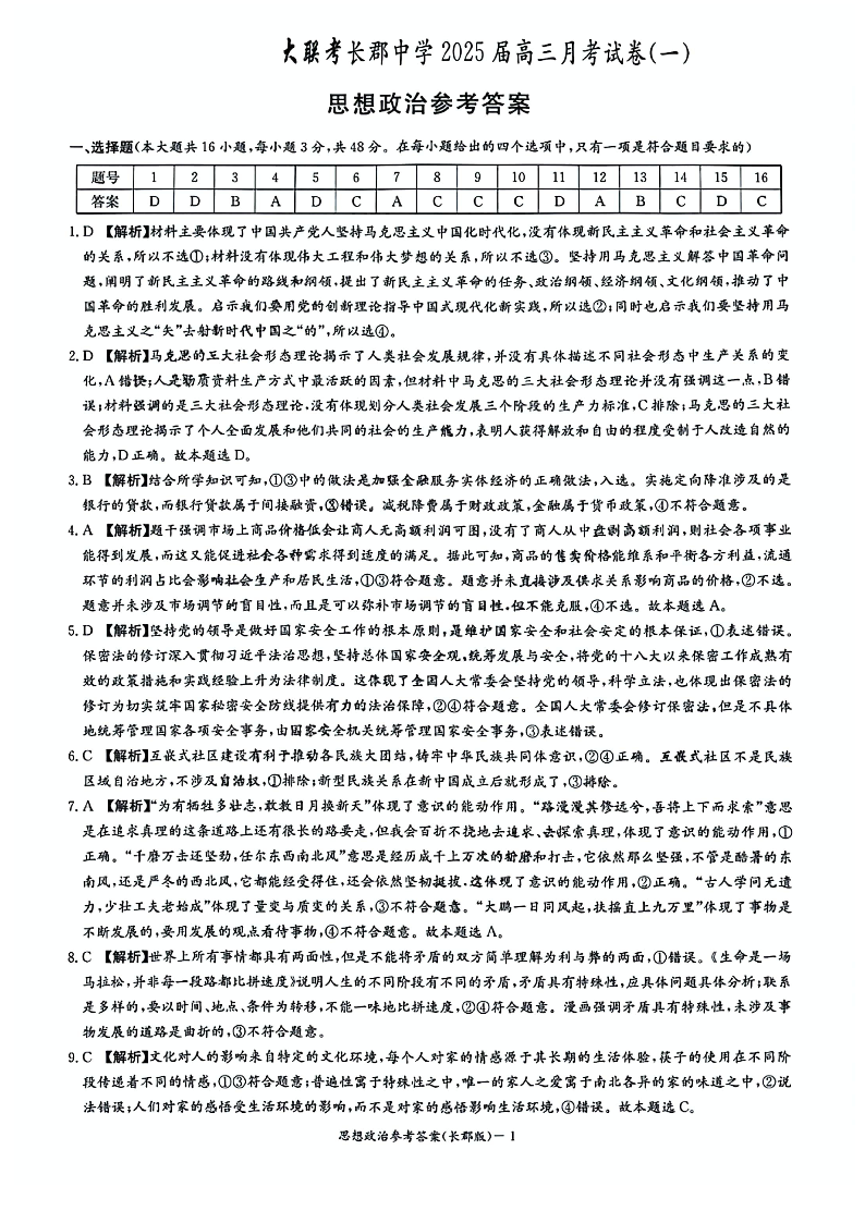 湖南省长郡中学2025届高三年级月考试卷(一)政治答案