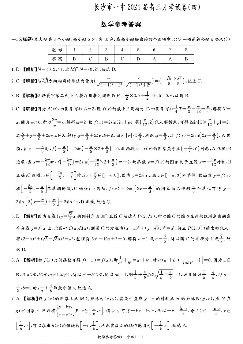 湖南省长沙市第一中学2023-2024学年高三上学期月考卷(四)数学答案
