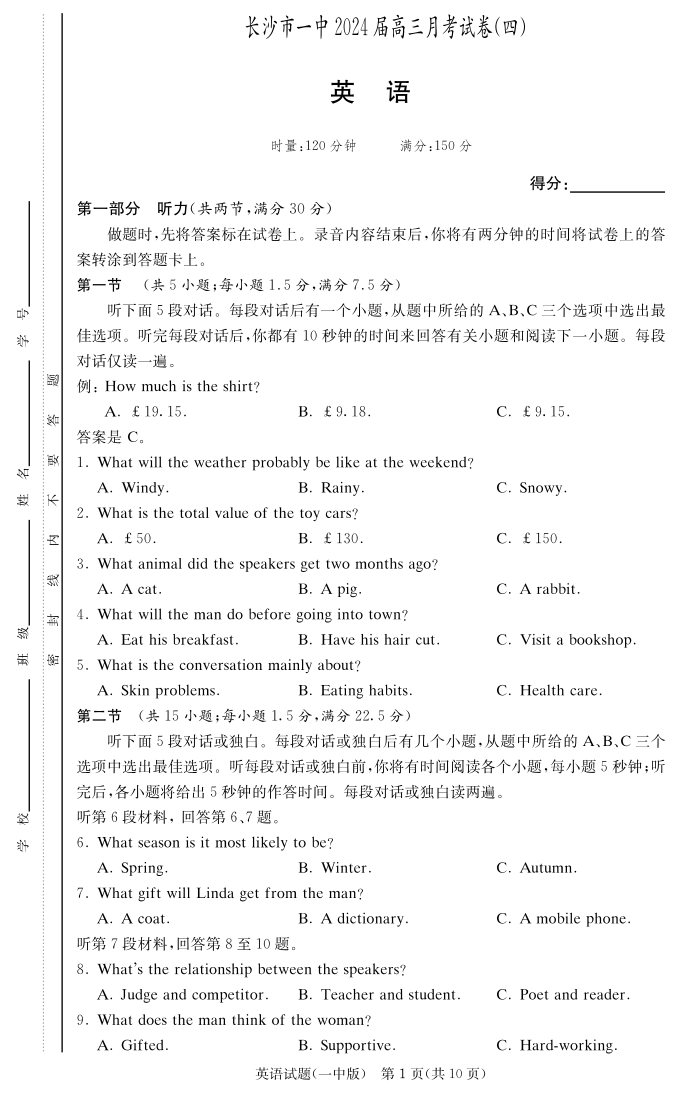 湖南省长沙市第一中学2023-2024学年高三上学期月考卷(四)英语