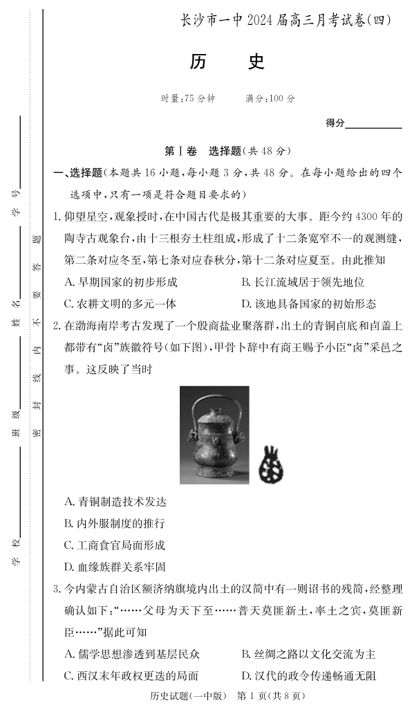 湖南省长沙市第一中学2023-2024学年高三上学期月考卷(四)历史