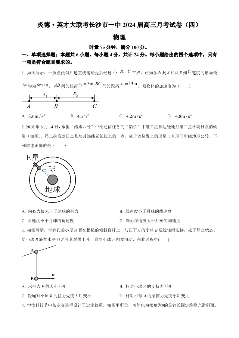湖南省长沙市第一中学2023-2024学年高三上学期月考卷(四)物理
