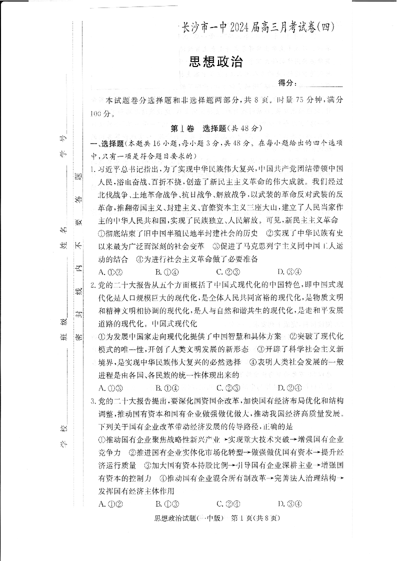 湖南省长沙市第一中学2023-2024学年高三上学期月考卷(四)政治