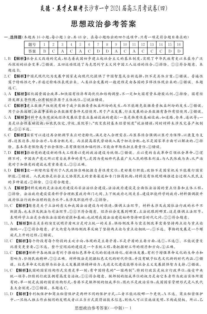 湖南省长沙市第一中学2023-2024学年高三上学期月考卷(四)政治答案