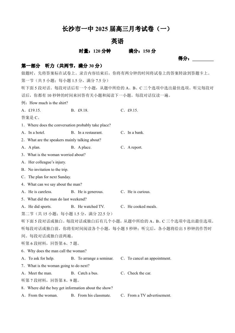 湖南省长沙市第一中学2025届高三上学期月考卷(一)英语