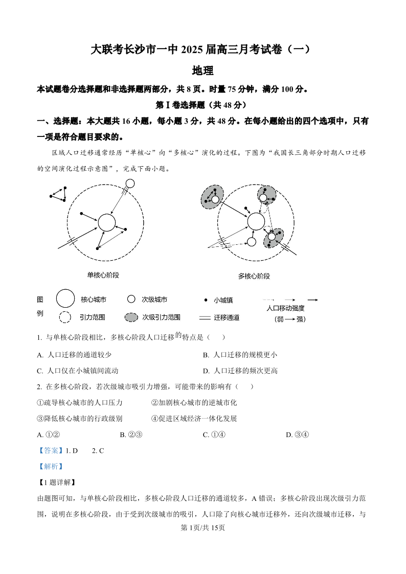 湖南省长沙市第一中学2025届高三上学期月考卷(一)地理答案