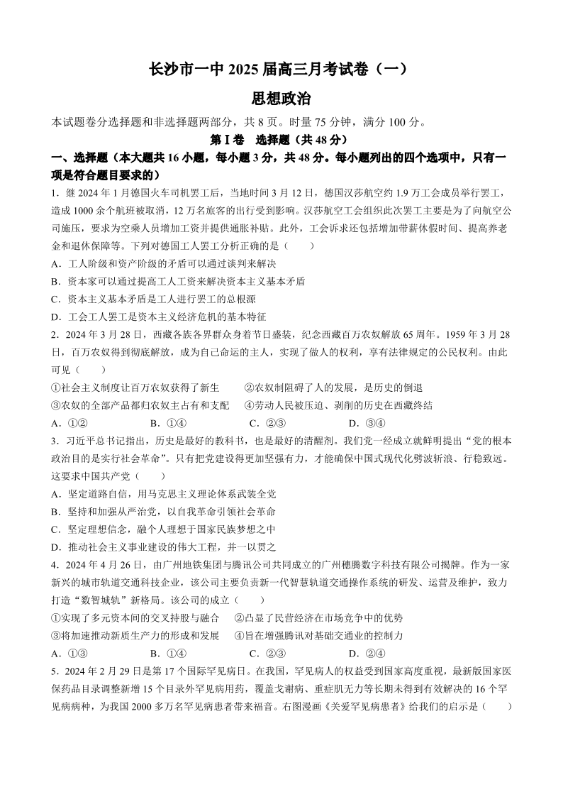湖南省长沙市第一中学2025届高三上学期月考卷(一)政治