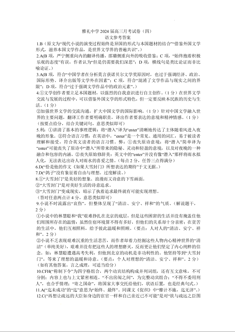 湖南省长沙市雅礼中学2023-2024学年高三上学期月考试卷(四)语文答案