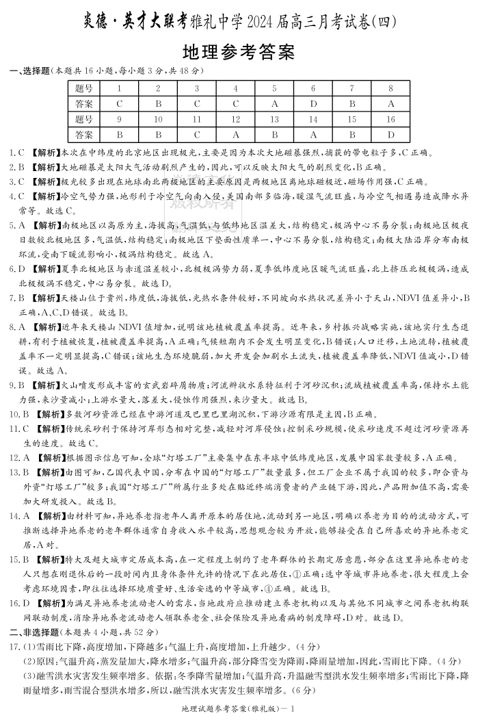 湖南省长沙市雅礼中学2023-2024学年高三上学期月考试卷(四)地理答案