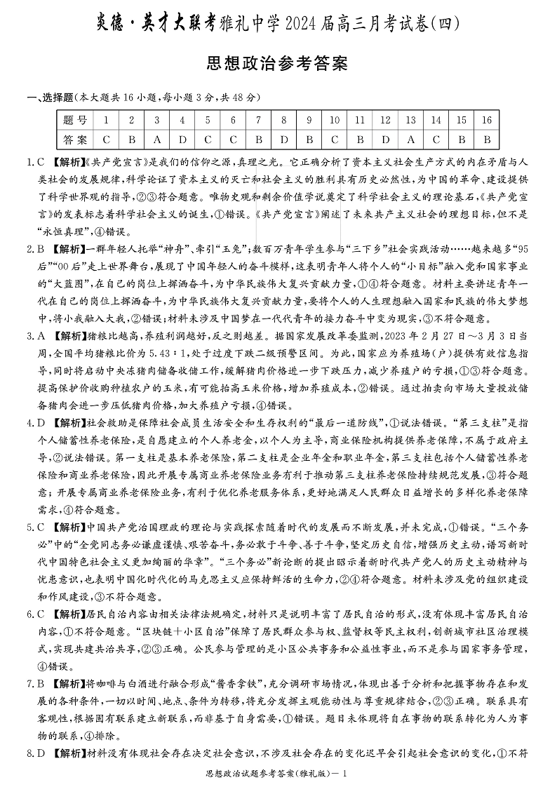 湖南省长沙市雅礼中学2023-2024学年高三上学期月考试卷(四)政治答案