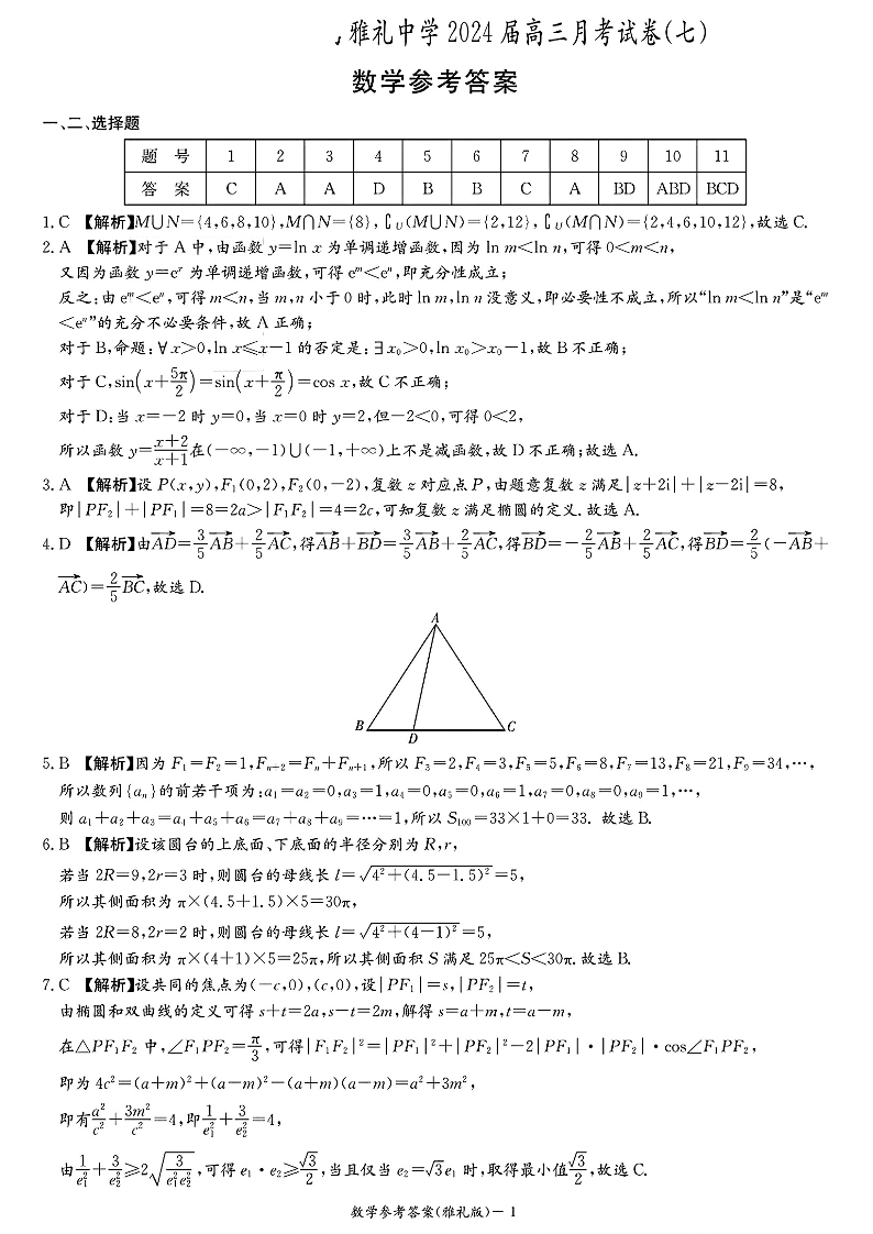 湖南省长沙市雅礼中学2023-2024学年高三下学期月考(七)数学答案