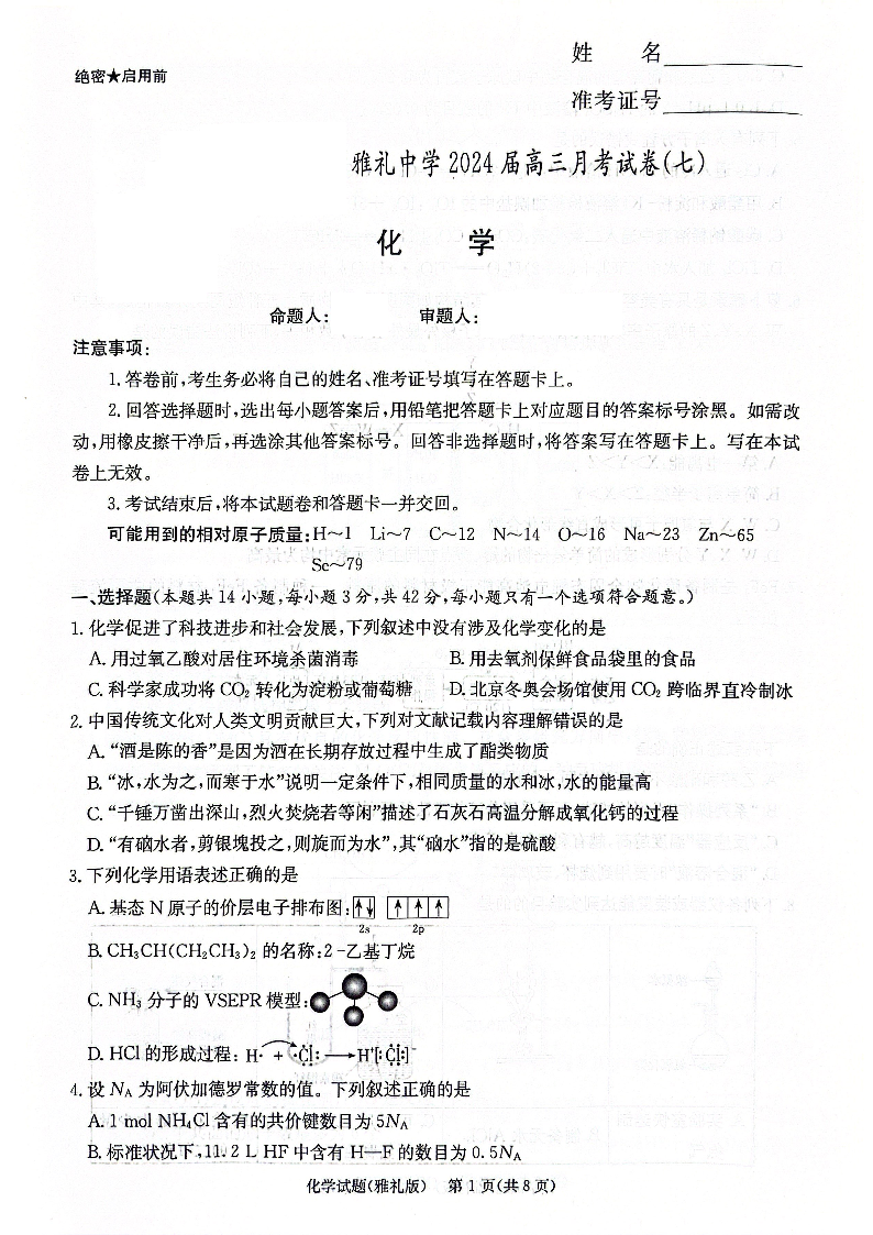 湖南省长沙市雅礼中学2023-2024学年高三下学期月考(七)化学