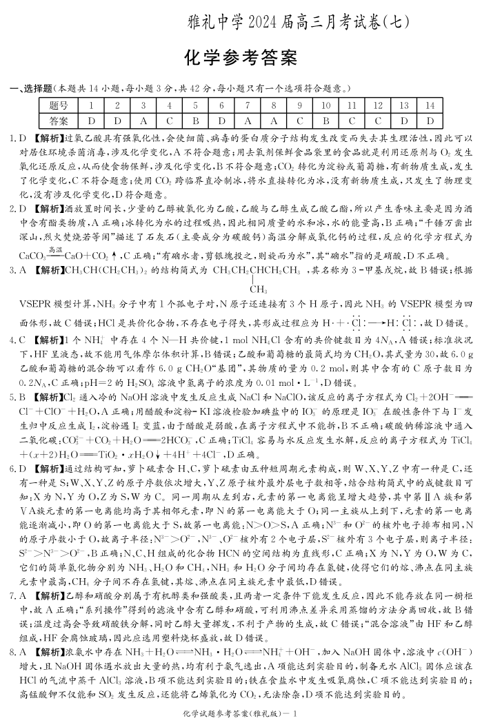 湖南省长沙市雅礼中学2023-2024学年高三下学期月考(七)化学答案