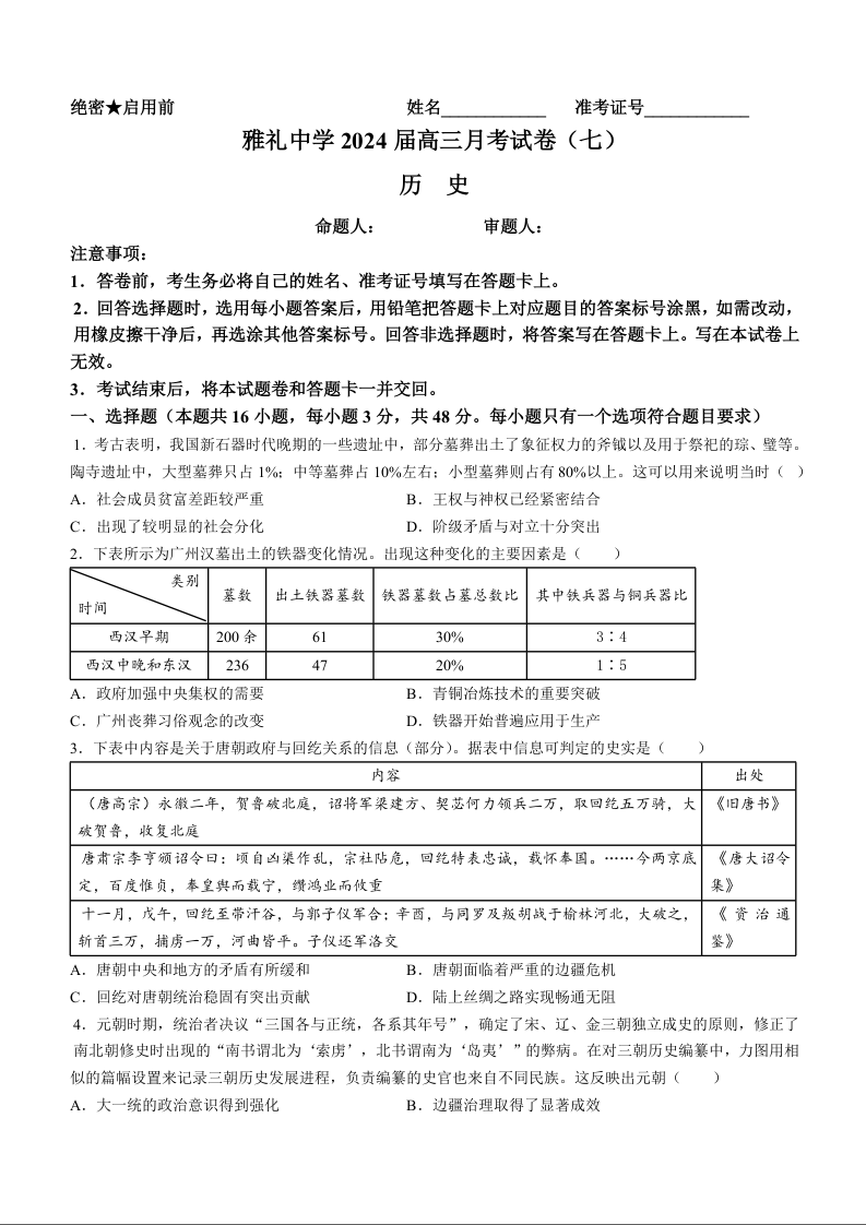 湖南省长沙市雅礼中学2023-2024学年高三下学期月考(七)历史