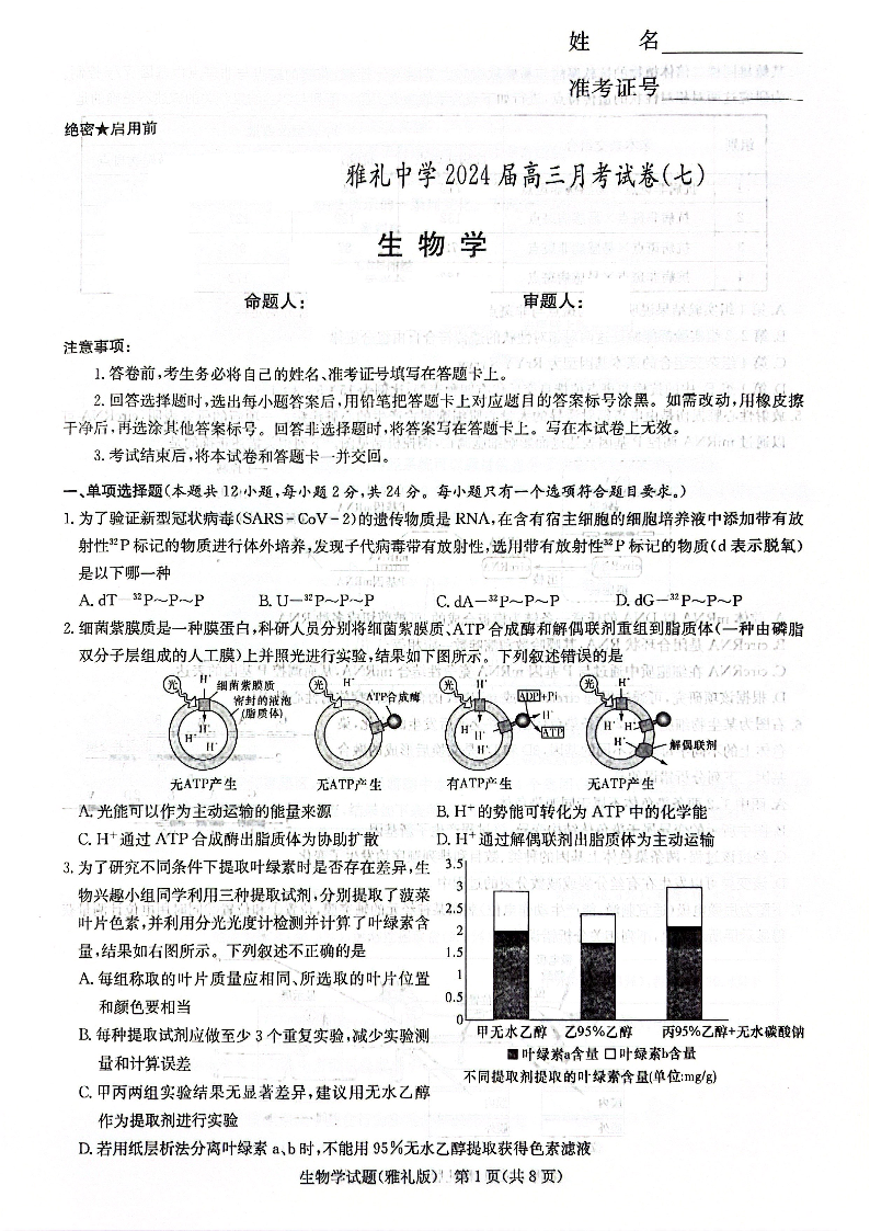 湖南省长沙市雅礼中学2023-2024学年高三下学期月考(七)生物