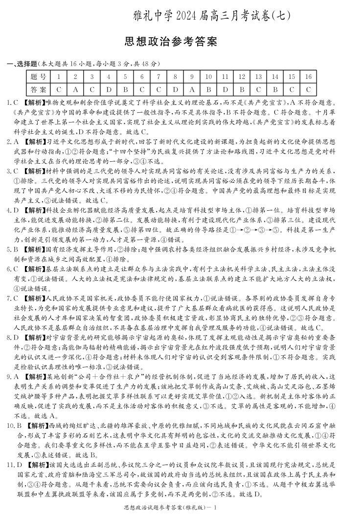 湖南省长沙市雅礼中学2023-2024学年高三下学期月考(七)政治答案