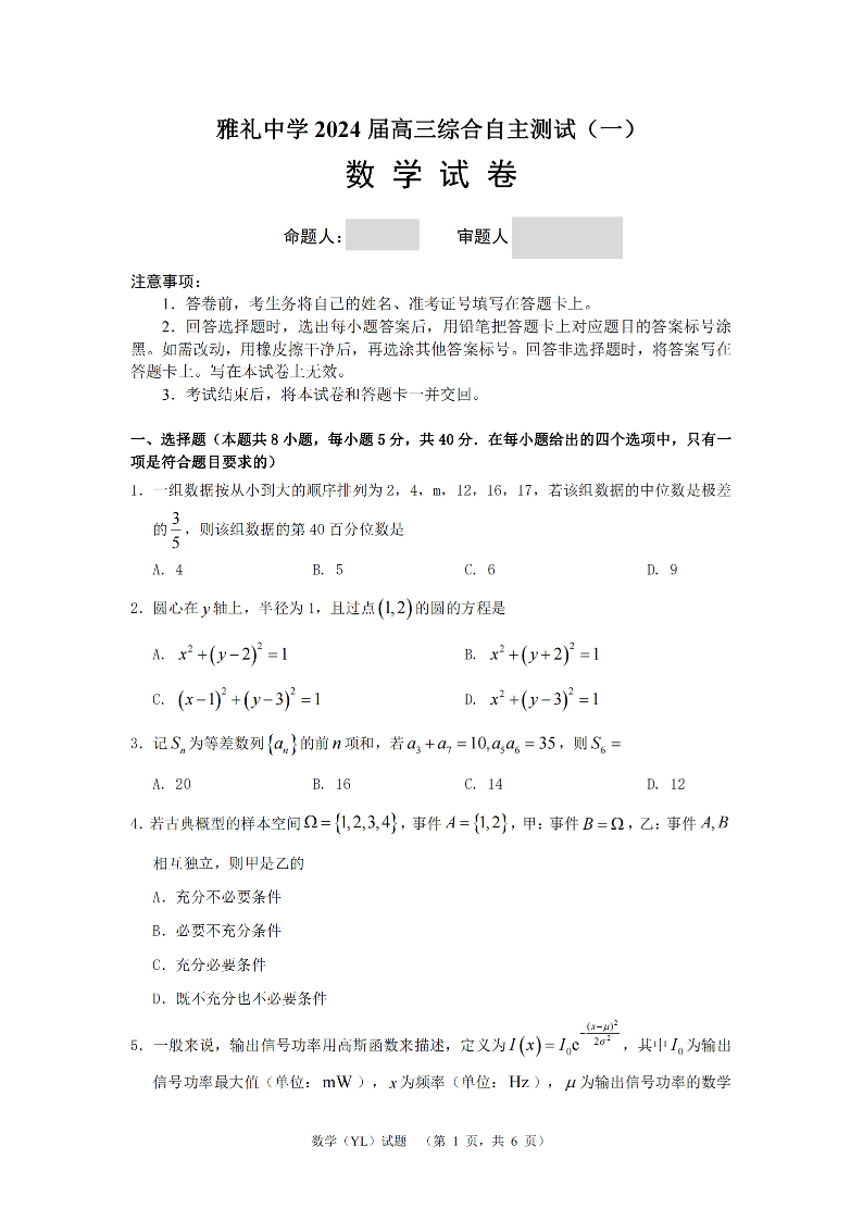 湖南省长沙市雅礼中学2024届高三下学期3月综合测试(一)数学
