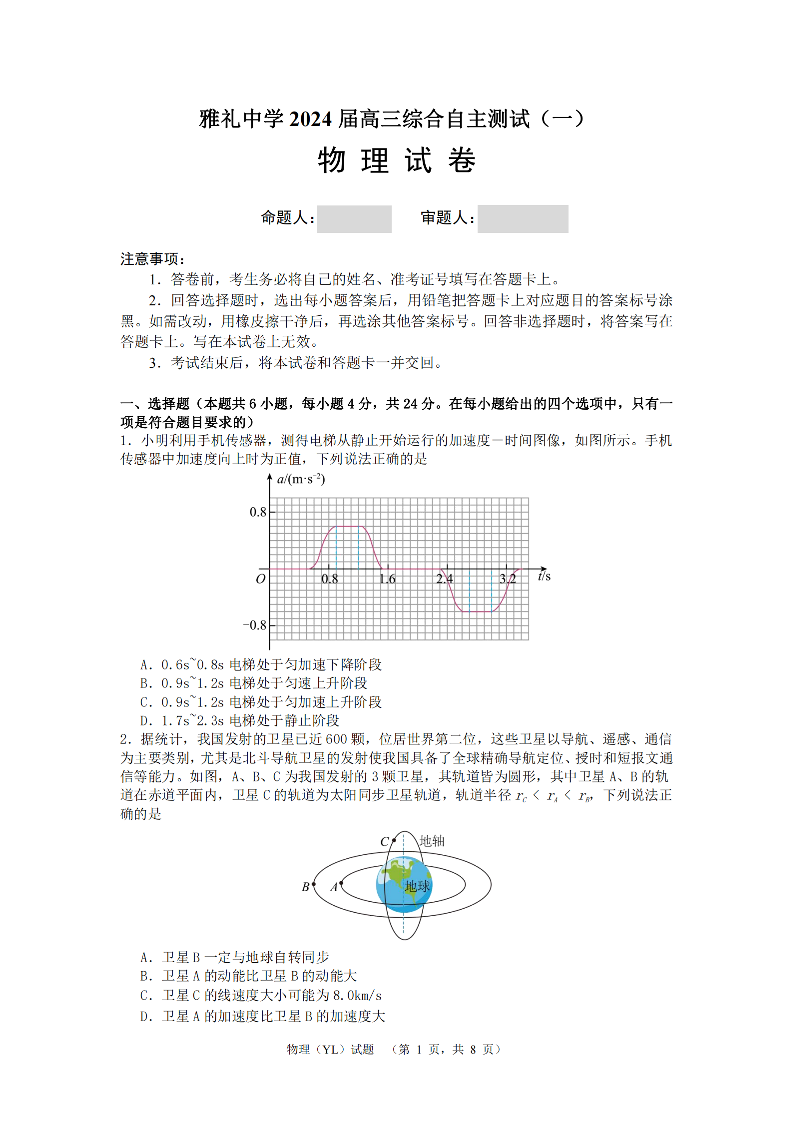 湖南省长沙市雅礼中学2024届高三下学期3月综合测试(一)物理
