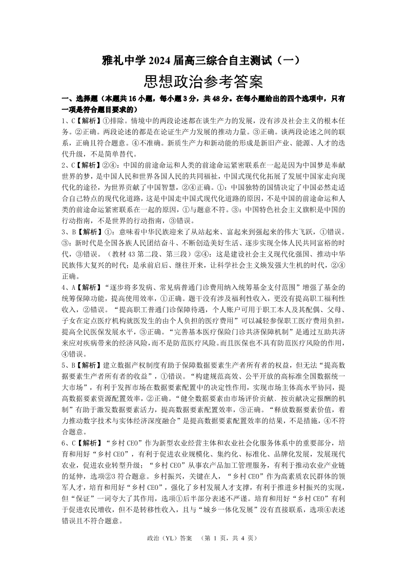 湖南省长沙市雅礼中学2024届高三下学期3月综合测试(一)政治答案