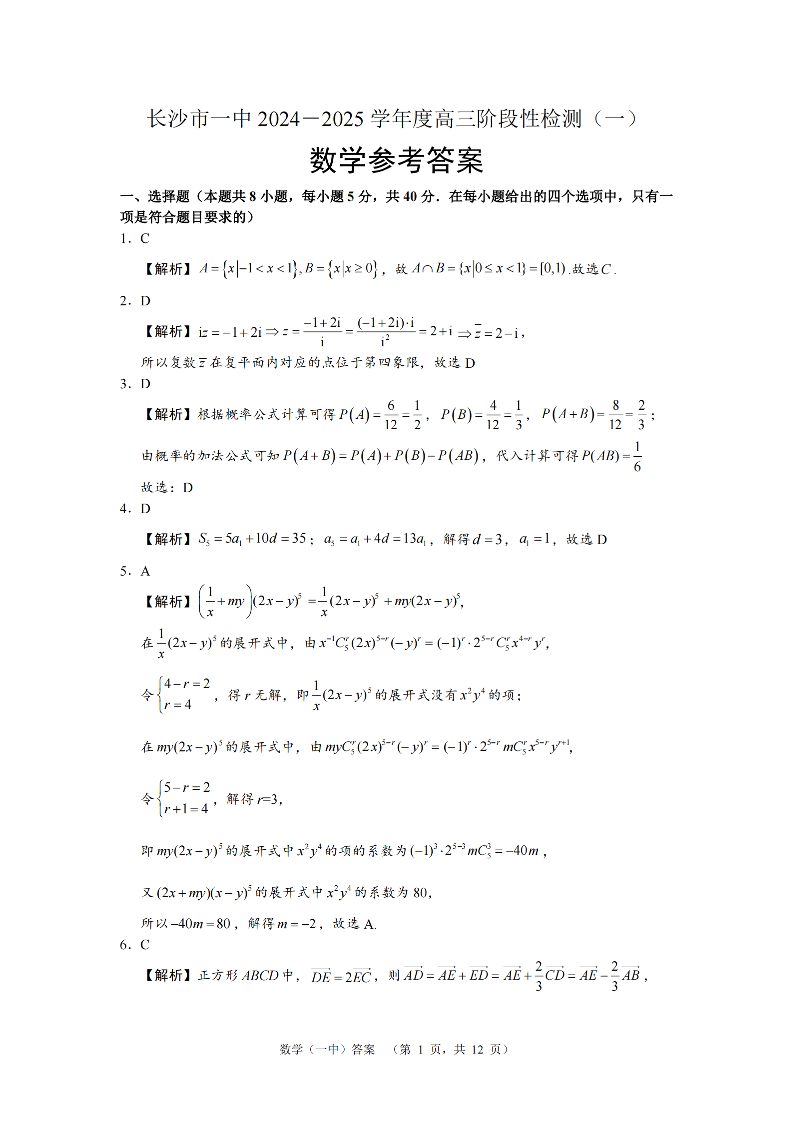湖南省长沙市一中2024-2025学年高三阶段性检测(一)数学答案