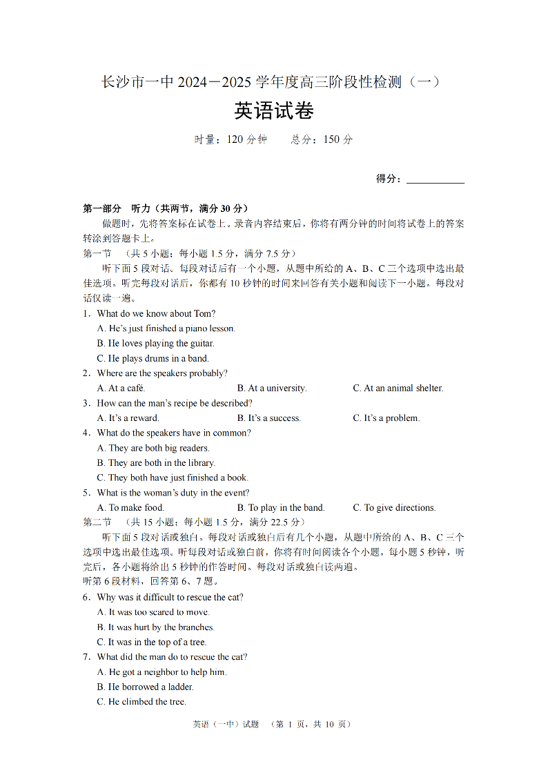 湖南省长沙市一中2024-2025学年高三阶段性检测(一)英语