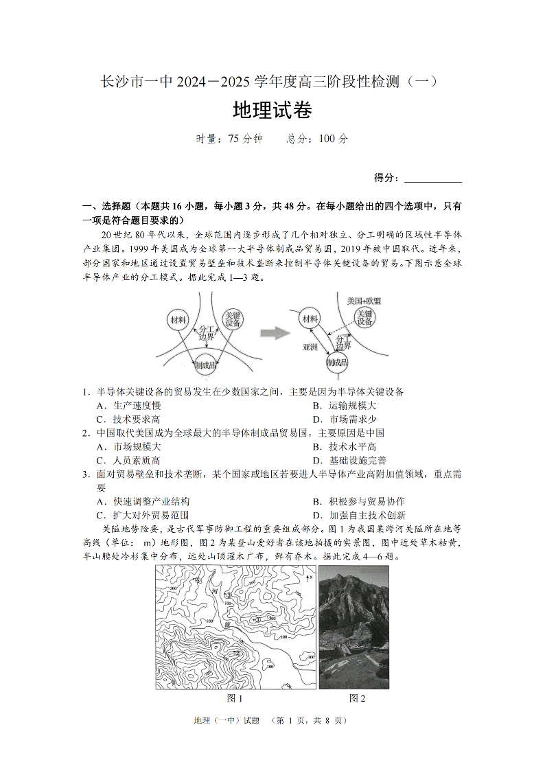 湖南省长沙市一中2024-2025学年高三阶段性检测(一)地理