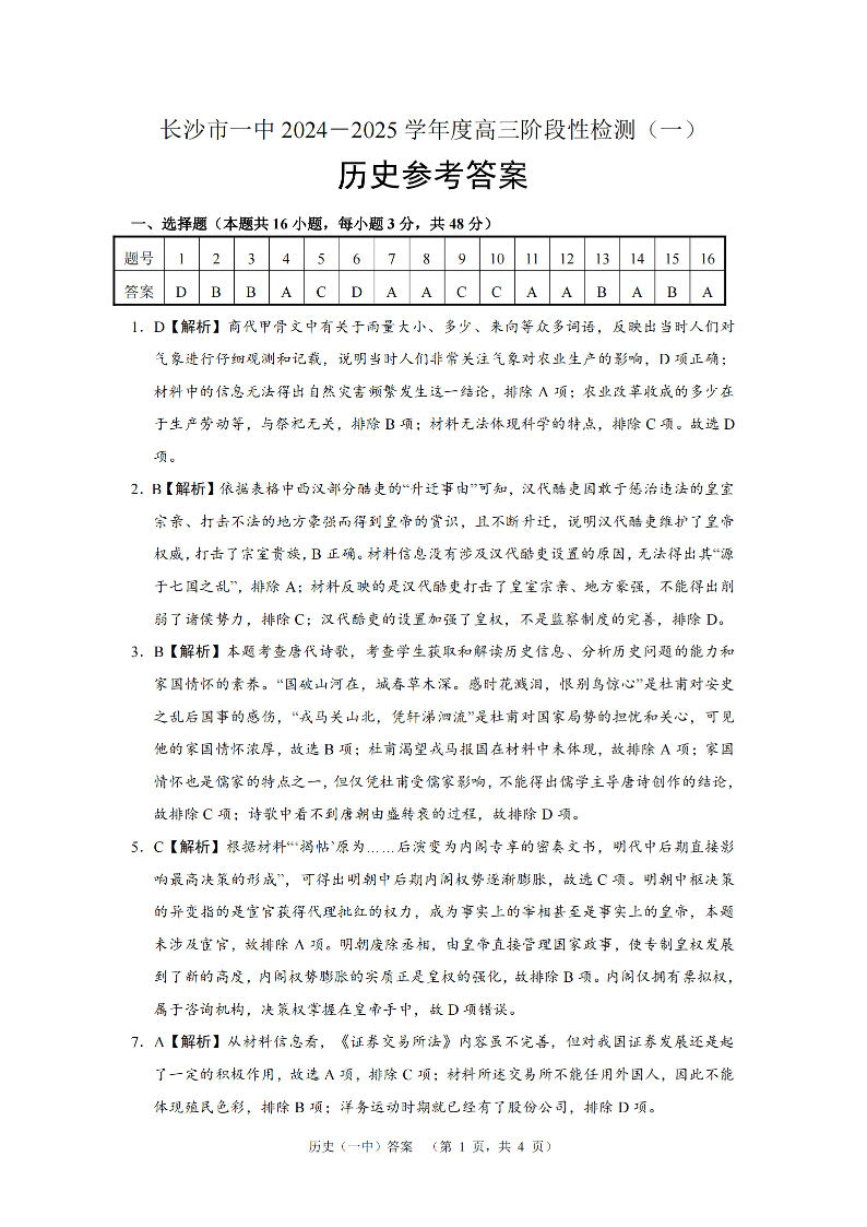 湖南省长沙市一中2024-2025学年高三阶段性检测(一)历史答案