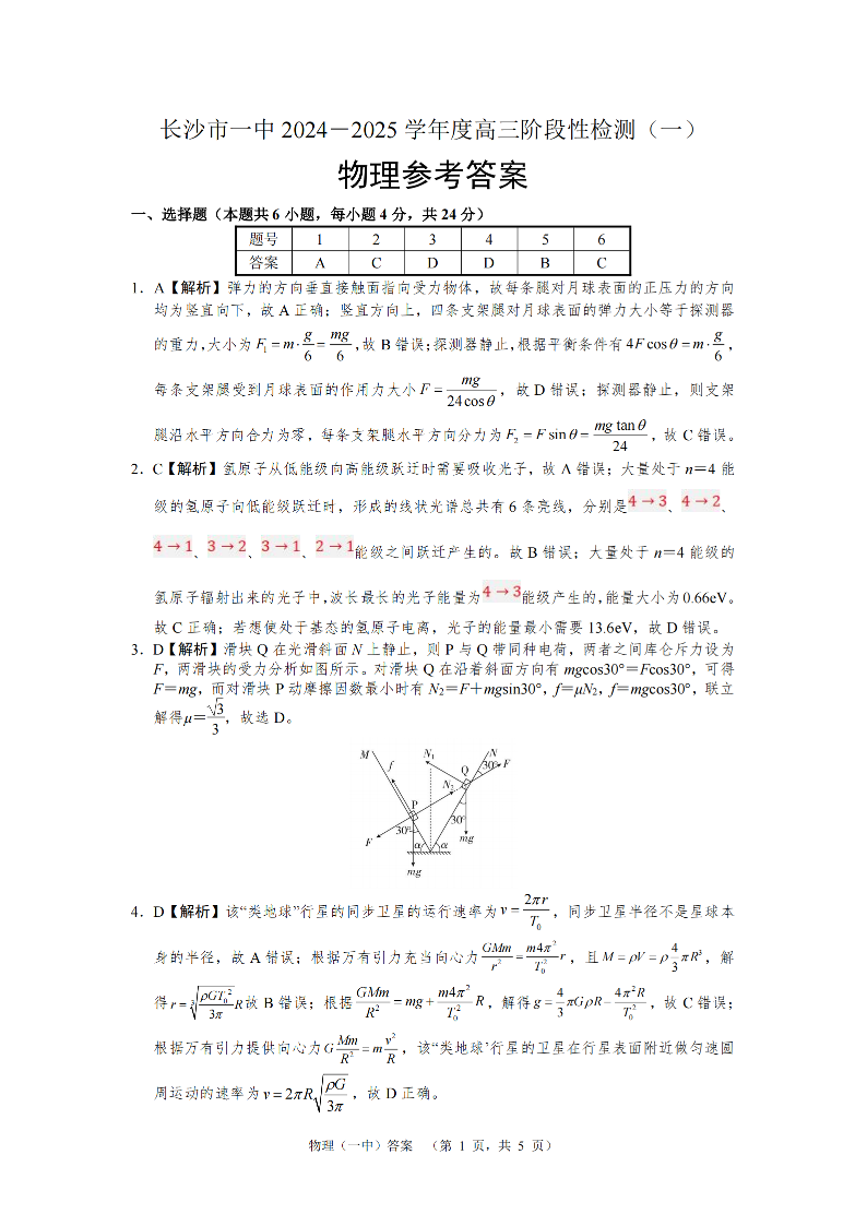 湖南省长沙市一中2024-2025学年高三阶段性检测(一)物理答案