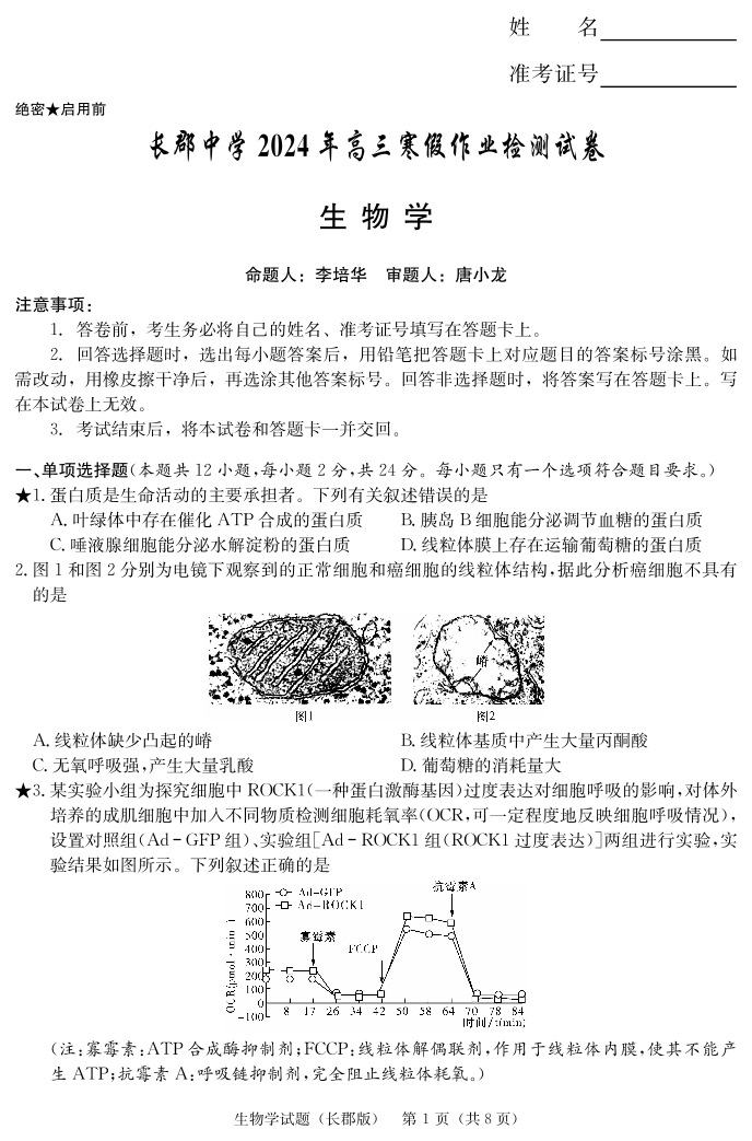 湖南省长沙市长郡中学2023-2024学年高三下学期寒假作业检测(月考六)生物