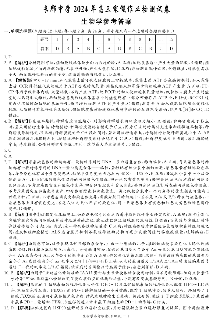 湖南省长沙市长郡中学2023-2024学年高三下学期寒假作业检测(月考六)生物答案
