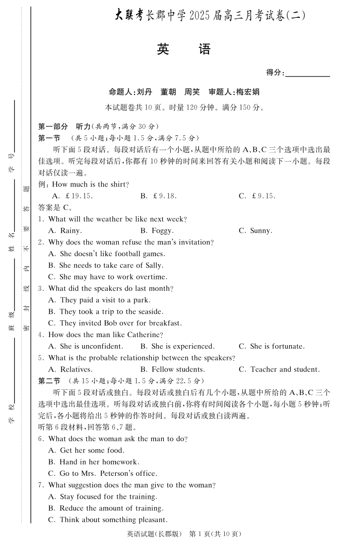 湖南省长沙市长郡中学2025届高三上学期月考(二)英语