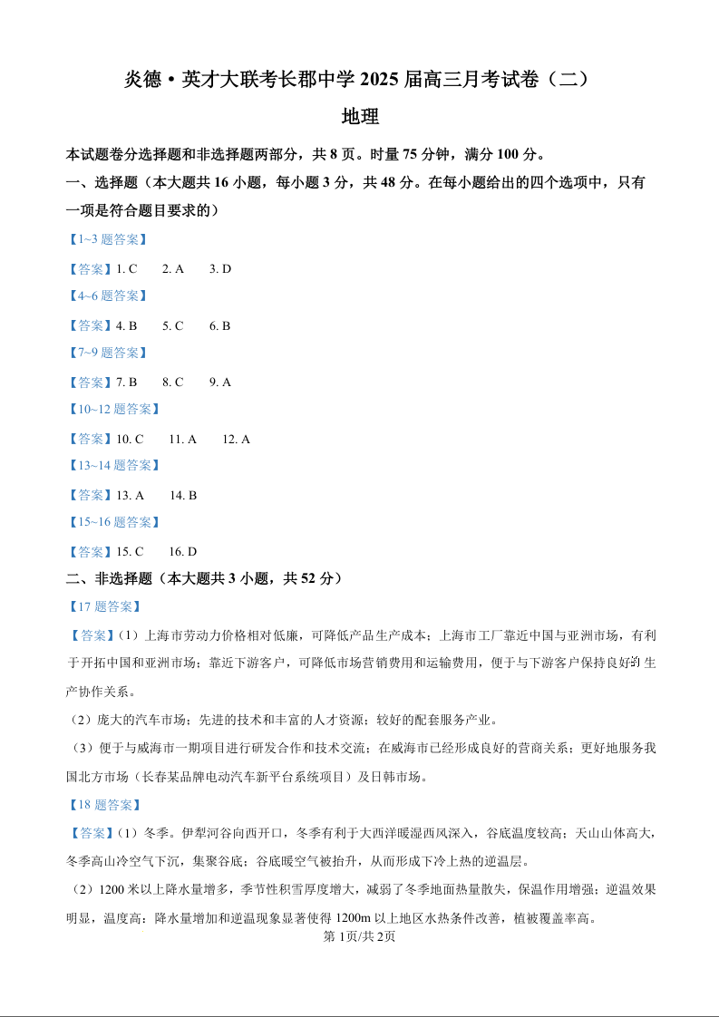 湖南省长沙市长郡中学2025届高三上学期月考(二)地理答案