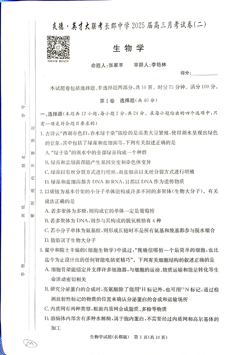 湖南省长沙市长郡中学2025届高三上学期月考(二)生物