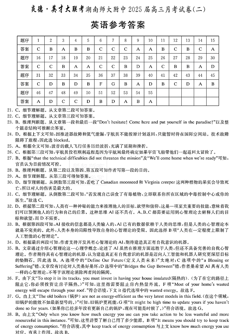 湖南师大附中2025届高三月考试卷(二)+英语答案