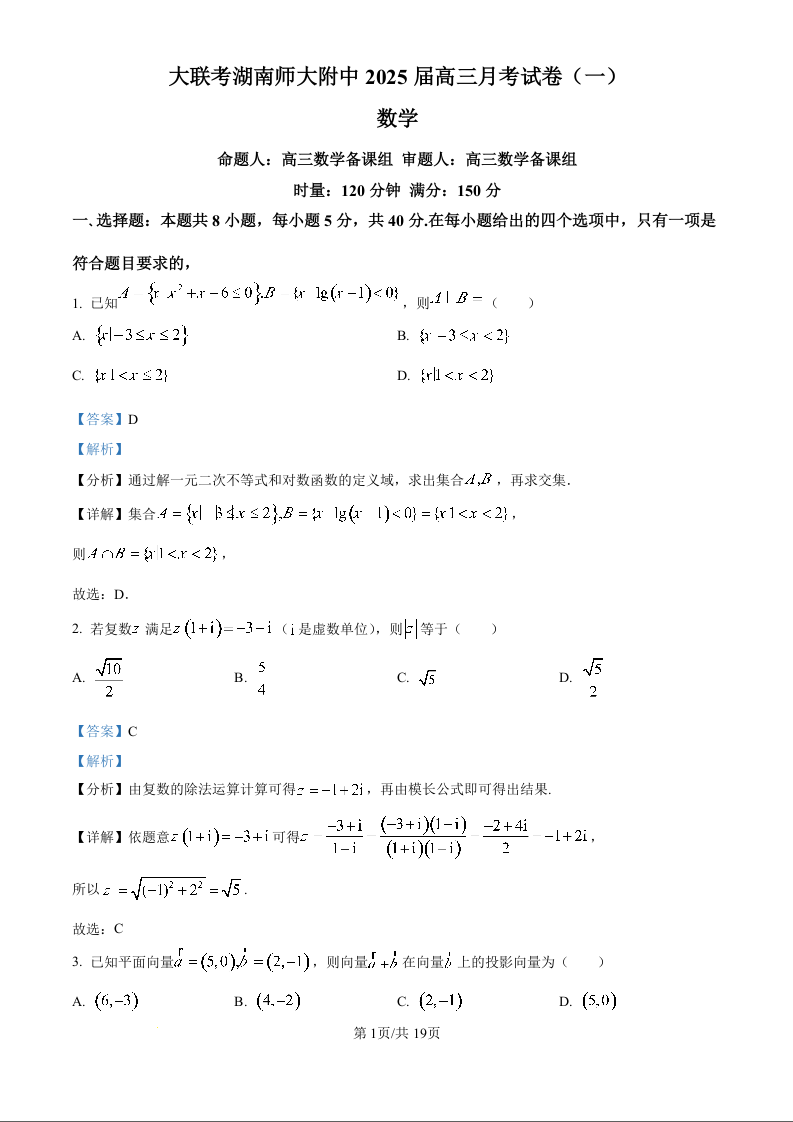 湖南师大附中2025届高三月考试卷(一)数学答案