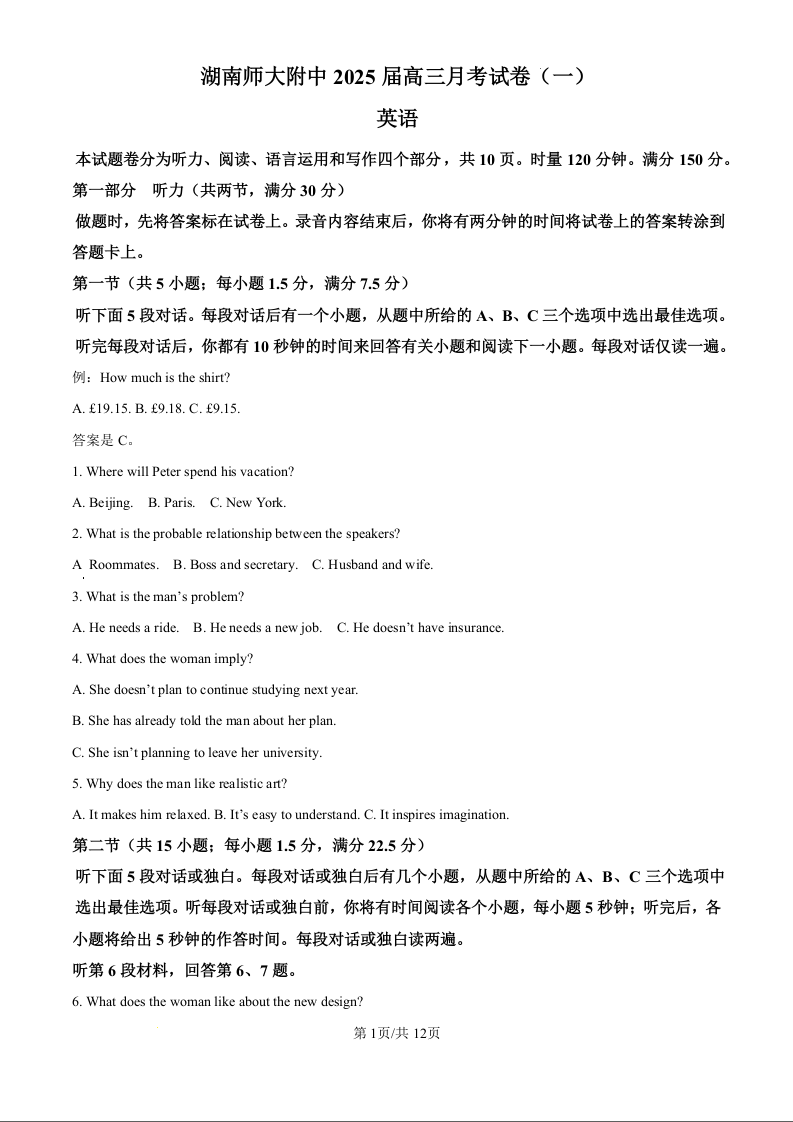 湖南师大附中2025届高三月考试卷(一)英语