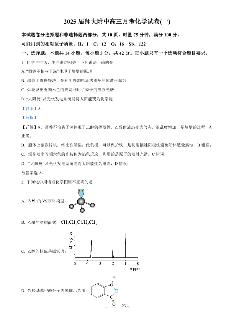 湖南师大附中2025届高三月考试卷(一)化学答案